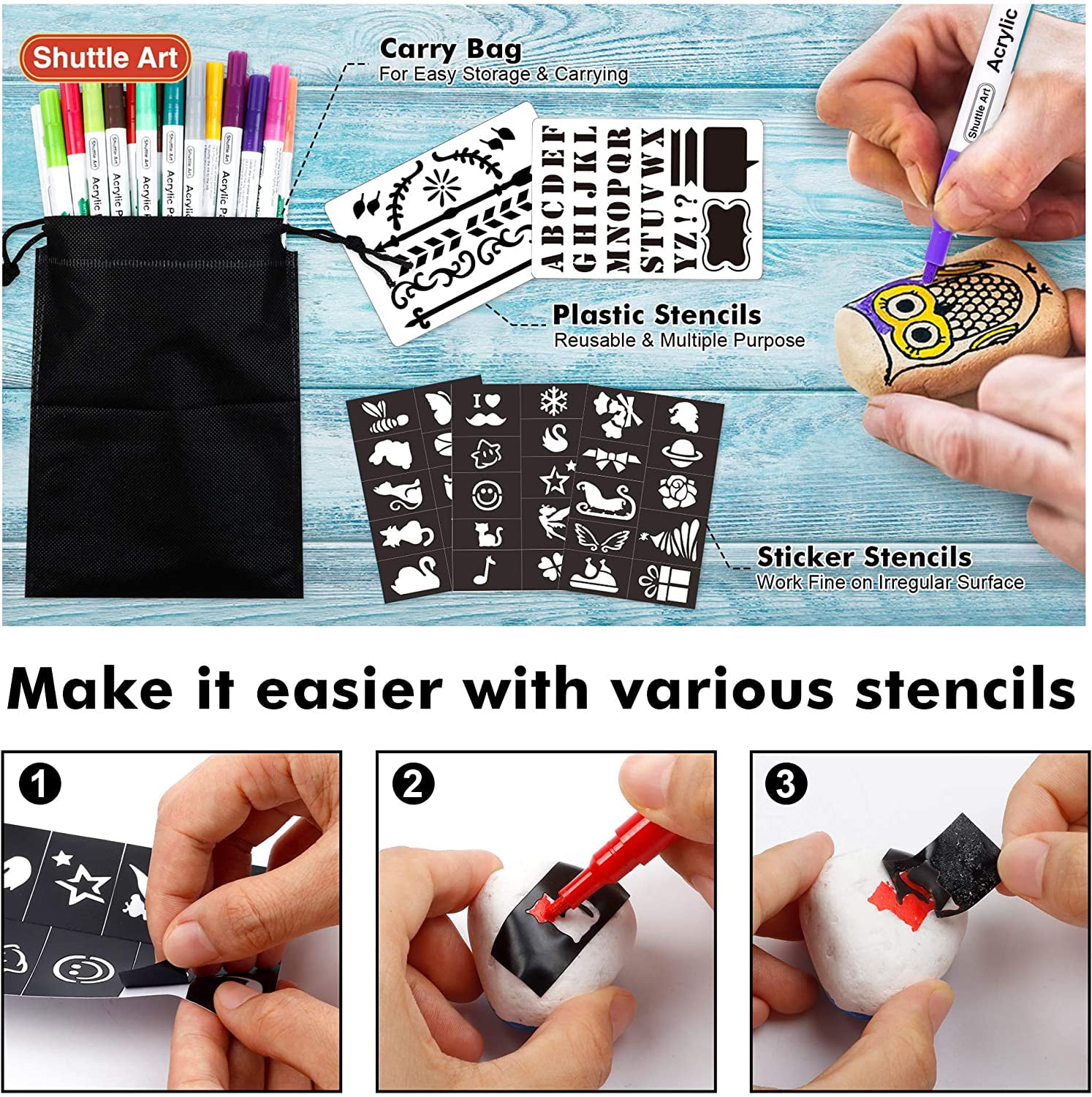Paint Pens Shuttle Art 26 Colors Acrylic Paint Markers With Stencils Low Odor Water Based Quick Dry Paint Markers For Rock Wood Metal Plastic Glass Canvas Ceramic Walmart Com
